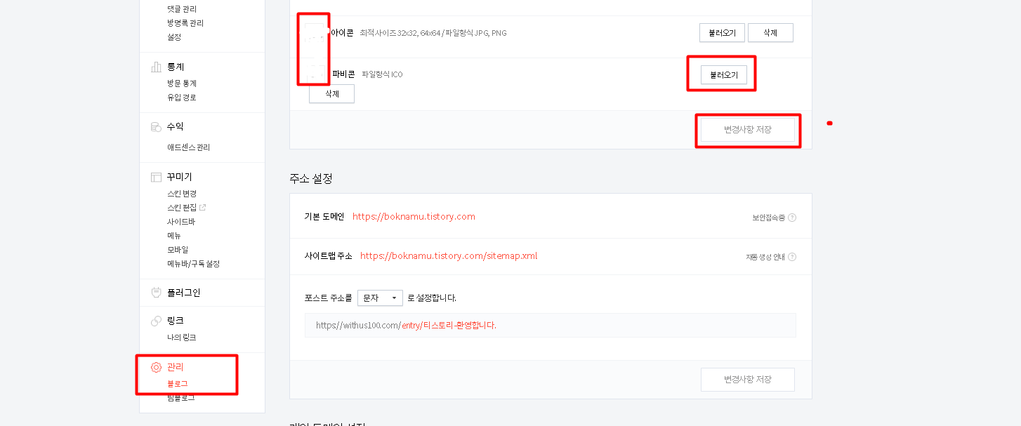 티스토리 관리 > 블로그 > 파비콘에 불러오기 클릭 > 파일 업로드 후 변경사항 저장
