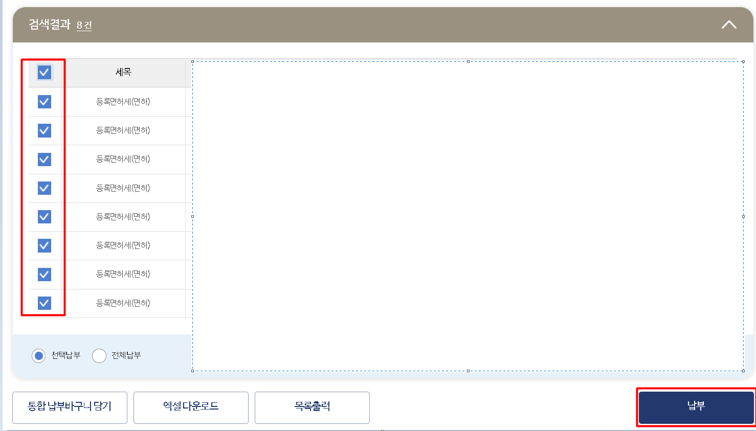 전체 Check 표시 > 납부 클릭