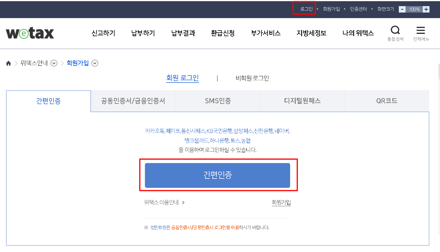 공인인증서 또는 간편인증을 통해 로그인