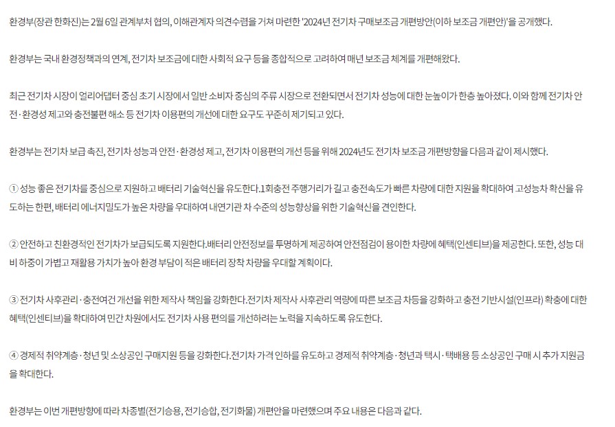 2월 6일에 환경부에서 전기차 구매 보조금 개편안에 대해 공개하였습니다